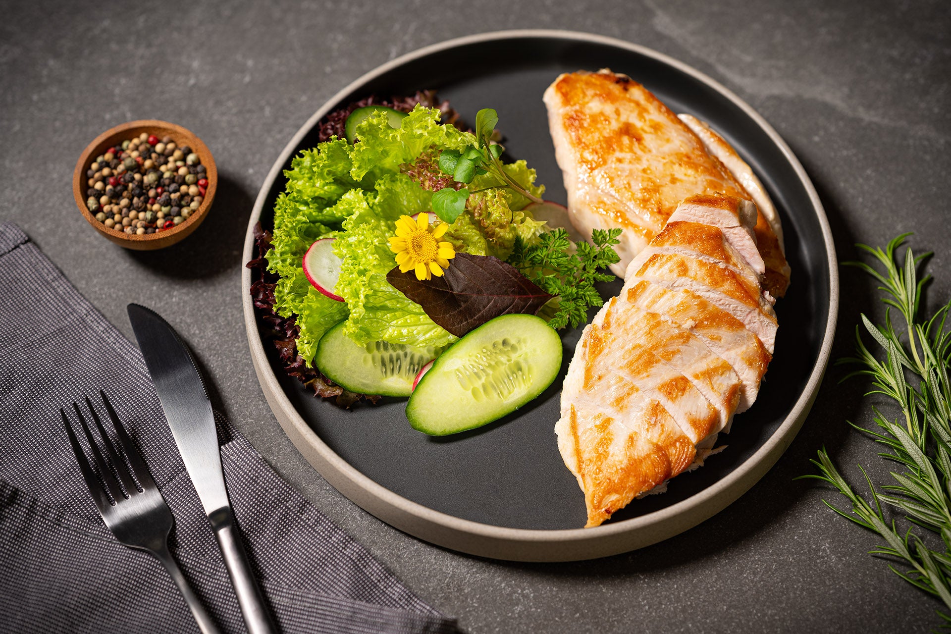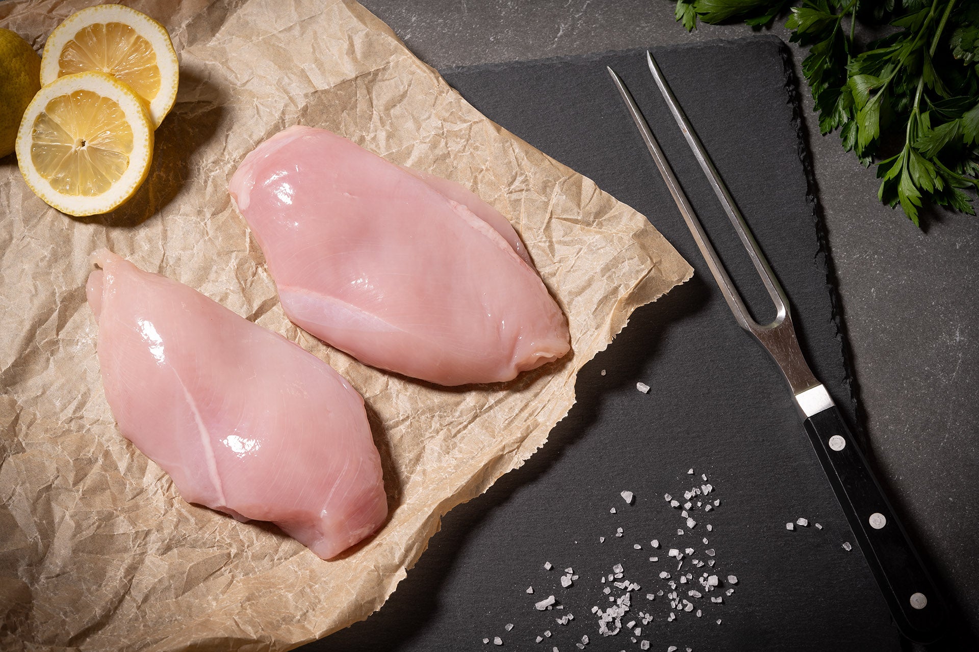 - 4 saftige Bio-Hähnchenbrustfilets ohne Haut und ohne Knochen, je 2 Stück, je ca. 350 g vakuumiert