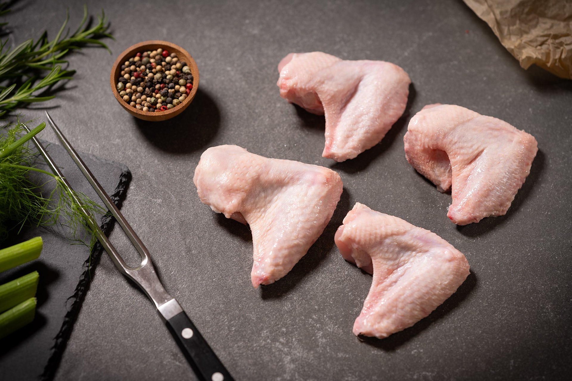 - 8 würzige Bio-Hähnchenflügel ohne Spitzen, mit Haut und mit Knochen, je 4 Stück, je ca. 400 g vakuumiert